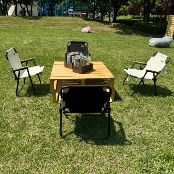 바닥에 잔디깔고, 의자 옆에 우유박스 테이블 놓고,